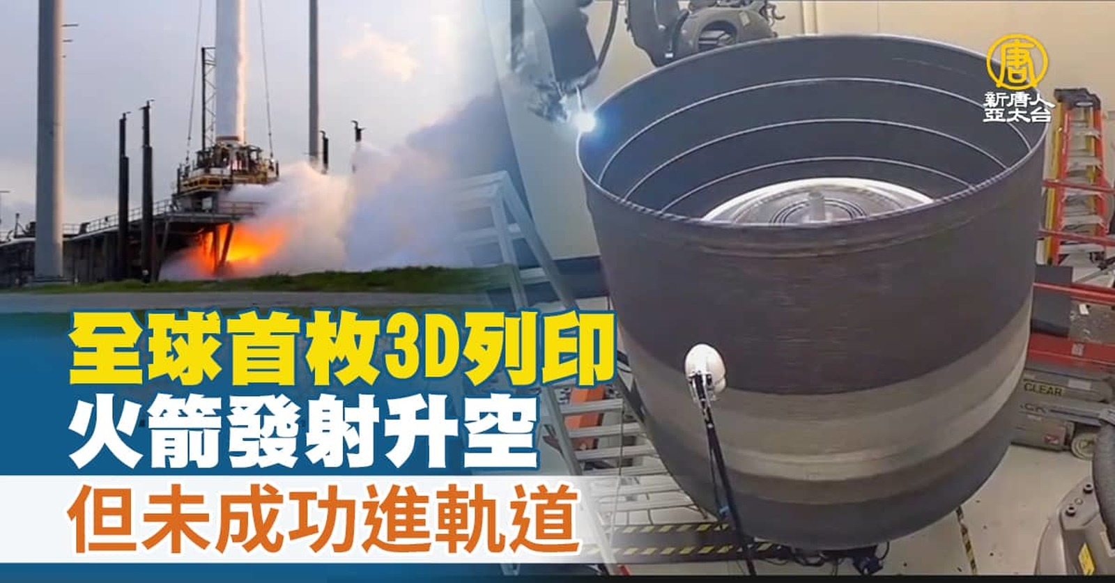 全球首枚3D列印火箭「人族一號」,在3月22日成功點火發射起飛,但最終因沒能進入預定軌道,發射任務再次失敗。 //asset2.ntdtv.com.tw/public/uploads/assets/2023/03/24/2023-03-24-641da014471cb.mp4 3D列印火箭|相對論空間2023-03-24 20:56:48