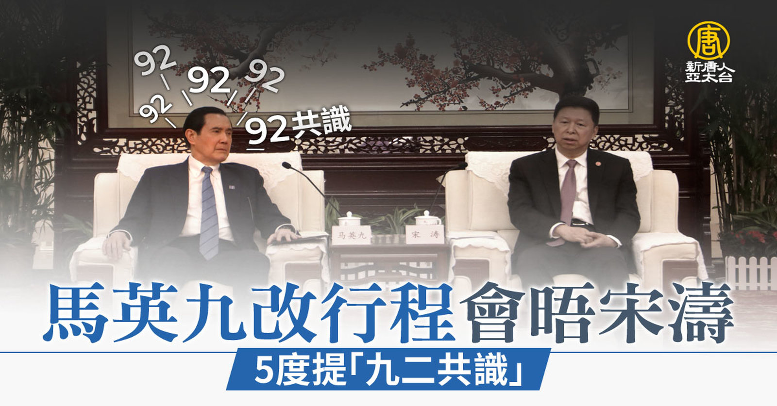 馬英九改行程會晤宋濤 5度提「九二共識」