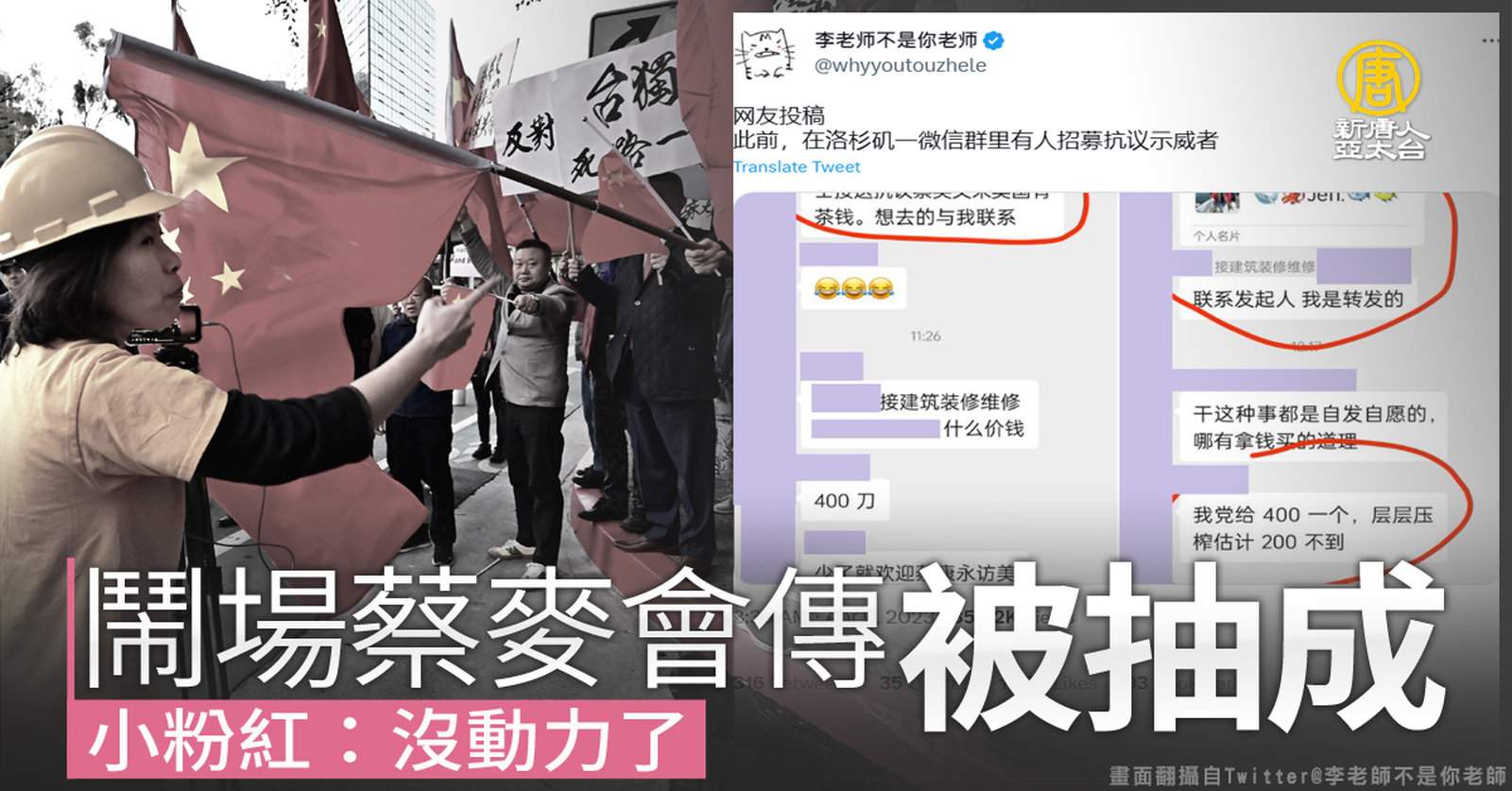 蔡總統過境紐約時,中共動員僑民抗議的證據,陸續曝光。台美安全單位掌握情資顯示,中共分別以美金200元和400元動員走路工,前往蔡總統下塌的飯店與雷根圖書館「陳抗」。另外推特還流出幾張對話截圖,疑似小粉紅們,抱怨原本400美元的酬勞,被層層剝削到只剩80美元。截圖下方小粉紅崩潰表示:「層層扒皮,搞得愛國都沒動力了。」 //asset1.ntdtv.com.tw/public/uploads/assets/2023/04/06/2023-04-06-642eb7983f27f.mp4 蔡麥會|麥卡錫|蔡英文|中共動員|走路工|過境美國2023-04-06 22:02:36