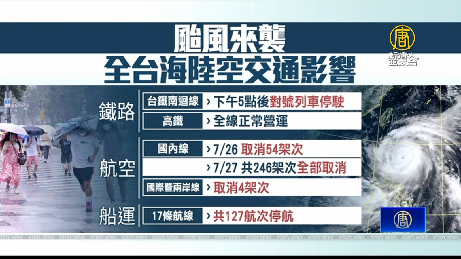 首先來看到,中度颱風杜蘇芮來襲,今天(26日)全台灣海陸空交通都受到影響,在鐵路方面,台鐵南迴線下午5點以後對號列車停駛;高速鐵路今天全線正常營運,如果遇到風速、雨量過大,達到運轉限制標準時,列車將採取行車速限。航空部分,民航局統計表示,截至下午14點,國內線取消54架次,國際暨兩岸線取消4架次,另外,明天(27日)國內線共246架次將全部取消。船運今天有17條航線,共127航次停航。 //asset2.ntdtv.com.tw/public/uploads/assets/2023/07/26/2023-07-26-64c0fe031fb73.mp4 杜蘇芮颱風|交通|台鐵|高鐵|航空|海運2023-07-26 19:02:00