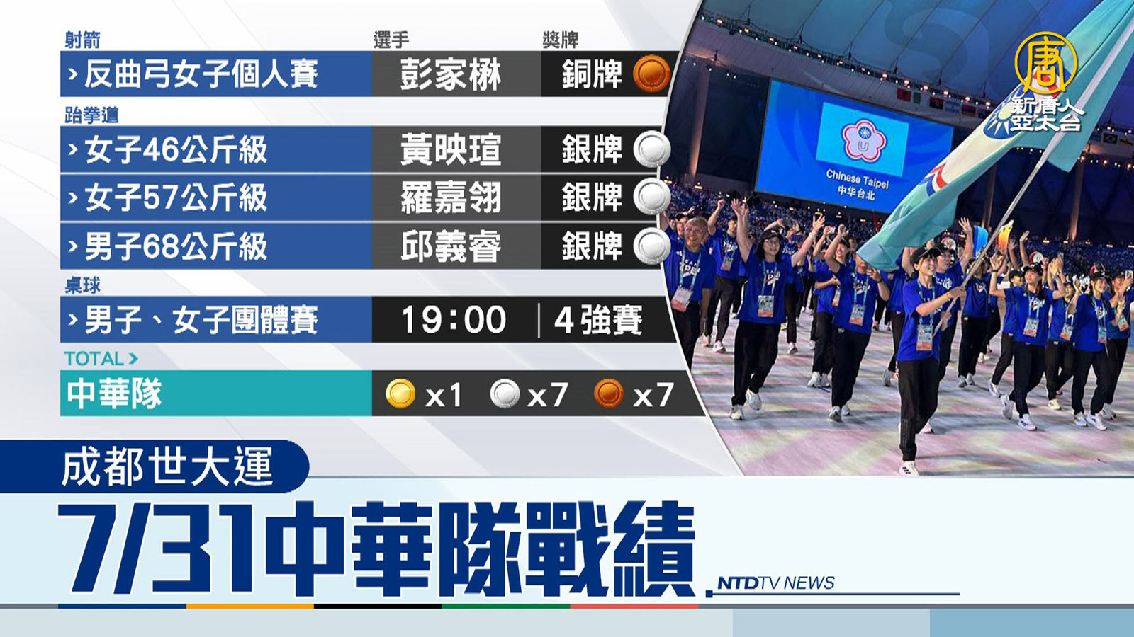 接著關心成都世大運,中華隊的賽況,在反曲弓女子個人賽項目,彭家楙今天(31日)摘下銅牌,也是台灣射箭隊本屆第4面獎牌。跆拳道方面,黃映瑄在女子46公斤拿下銀牌,羅嘉翎在女子57公斤級也拿下銀牌,邱義睿在男子68公斤級,同樣拿下銀牌。桌球項目,男子、女子團體賽都在今晚7點,攜手叩關4強賽,由於世大運的桌球項目第三、四名將會並列銅牌,所以中華隊確定再添兩面獎牌。目前中華隊共拿下1金7銀7銅。 //asset3.ntdtv.com.tw/public/uploads/assets/2023/07/31/2023-07-31-64c79a46c763c.mp4 成都世大運|跆拳道|桌球|彭家楙|羅嘉翎|黃映瑄|邱義睿2023-07-31 19:57:34
