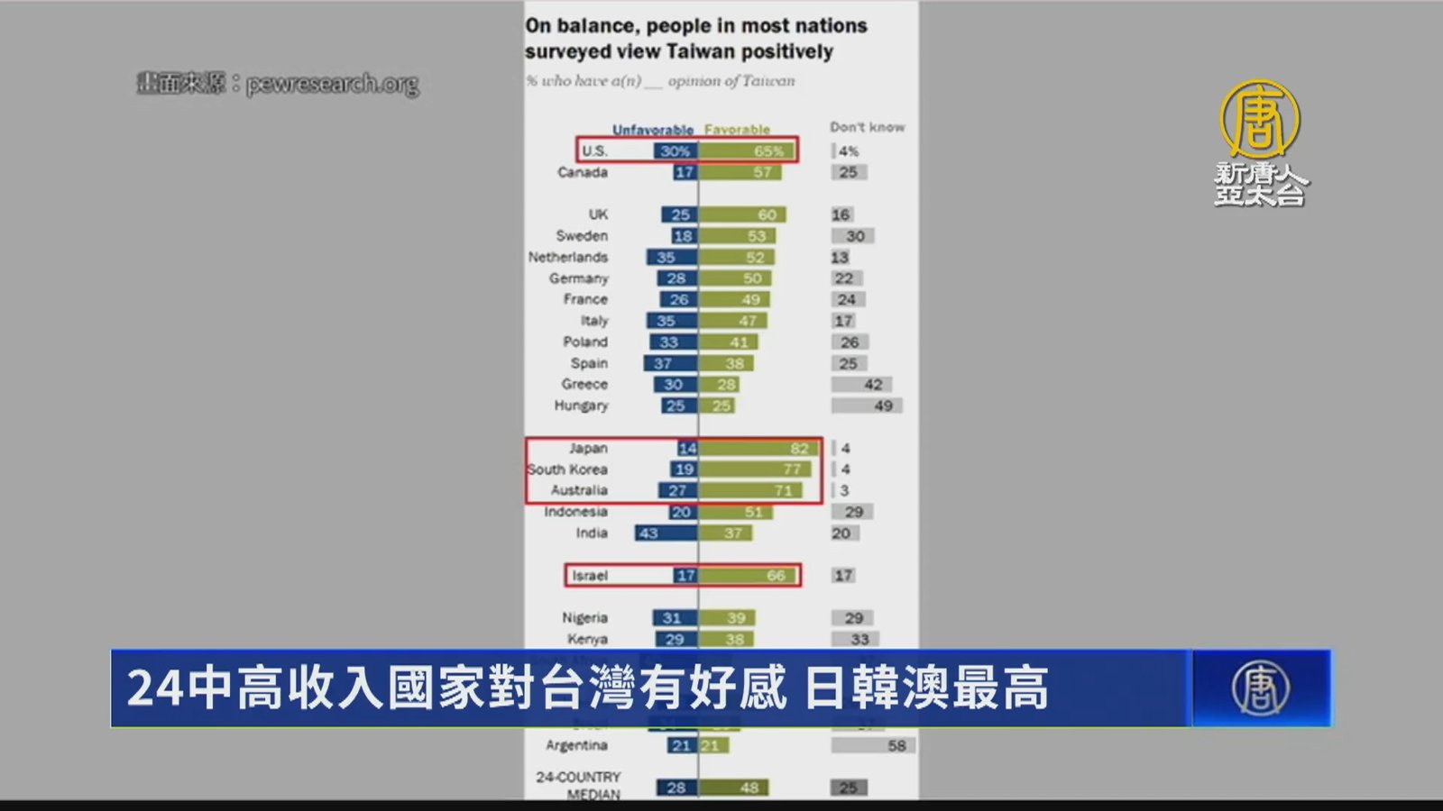 台灣近年來在國際間的關注度越來越高,皮尤研究中心調查指出,在全世界中有24個中高、中等收入的國家對台灣有正面的觀感, 而正面觀感比例最高的前五名國家分別為日本82%、南韓75%、澳洲70%、以色列66%與美國65%。而在非洲的奈及利亞、南非與肯亞,對中國的好感居多。 //asset3.ntdtv.com.tw/public/uploads/assets/2023/08/12/2023-08-12-64d768b5abdf0.mp4 國際對台灣好感度|正面觀感|日本|南韓|澳洲2023-08-12 20:10:13