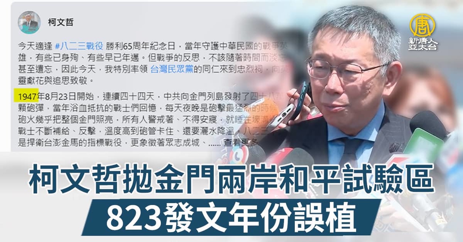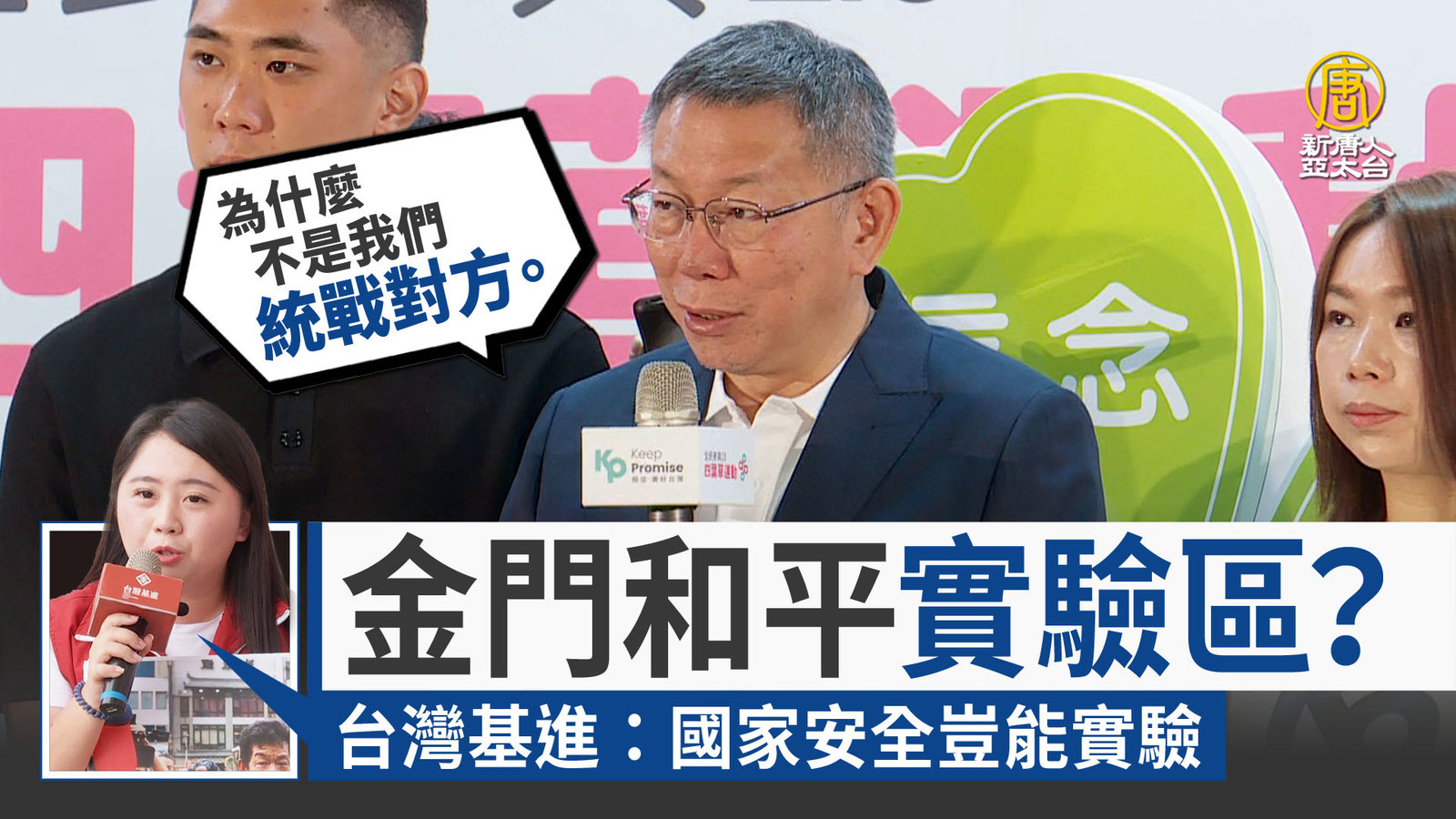 鴻海創辦人郭台銘昨天(23日)提出金門和平倡議,針對建造金廈大橋一事,主張先簽和平協議,不過台灣基進質疑,中共根本不可信,簽了也等於宣告台灣是內政問題。而對於柯文哲拋出「金門可當和平實驗區」的想法,台灣基進也直呼,國家安全是不能拿來實驗的。 //asset2.ntdtv.com.tw/public/uploads/assets/2023/08/24/2023-08-24-64e74a0d8b0a9.mp4 2024總統大選|柯文哲|郭台銘|台灣基進黨|八二三2023-08-24 19:56:01