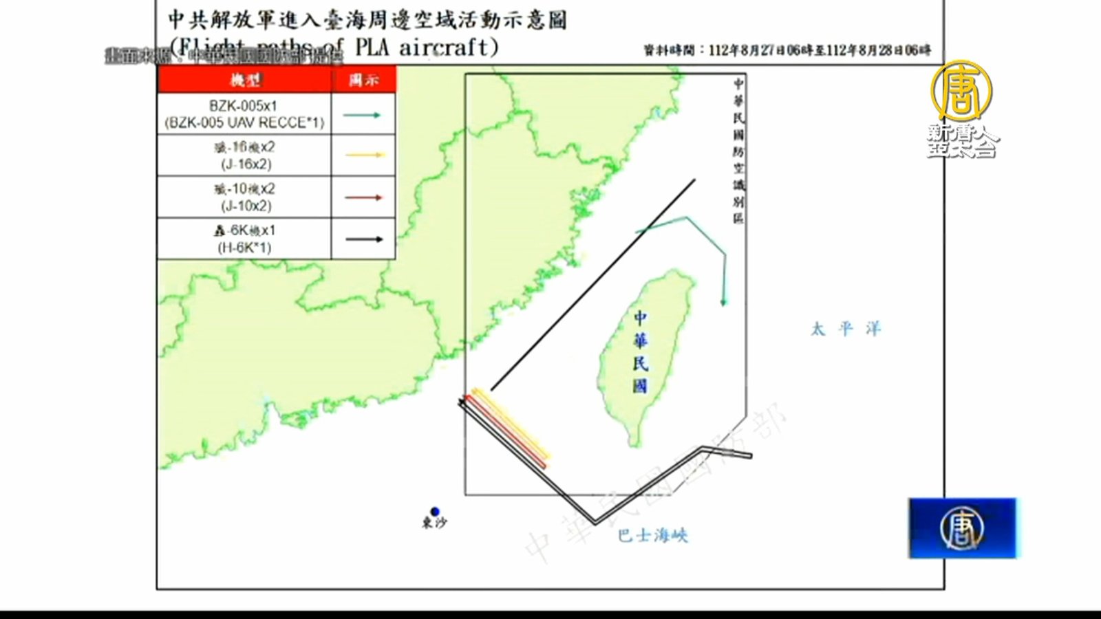 再來關心,共軍持續擾台,中華民國國防部表示,從27日清晨6點,到今天(28日)清晨6點止,國軍偵獲共機11架次共艦4艘次,持續在台海周邊活動,其中逾越海峽中線及其延伸線進入西南、東南及東北空域的共機有6架次,另外,有一架共軍BZK-005無人機,自北部空域繞行至宜蘭外海空域,行蹤詭異。國軍嚴密監控與應處。 //asset3.ntdtv.com.tw/public/uploads/assets/2023/08/28/2023-08-28-64ec81e4af8d7.mp4 共機|台海局勢2023-08-28 19:12:19
