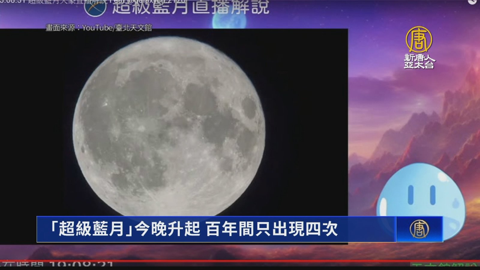 歡迎回來,觀眾朋友今天晚上可以抬頭看看天空,天文奇景「超級藍月」在今天晚上6點40分升起,但「藍月」並不是藍色的月亮,而是指同月份中的第2次滿月,在西方諺語中是指少見的事物。根據統計顯示,超級月亮和藍月同時發生的「超級藍月」非常少見,從1951至2050年的百年間只出現過4次,錯過今年這次,下次就要等到2029年。而台北天文館晚上7點起,也會同步進行網路直播。 //asset1.ntdtv.com.tw/public/uploads/assets/2023/08/31/2023-08-31-64f07eeb96257.mp4 超級藍月|超級月亮|藍月|天文奇景|藍月亮|滿月2023-08-31 19:48:27