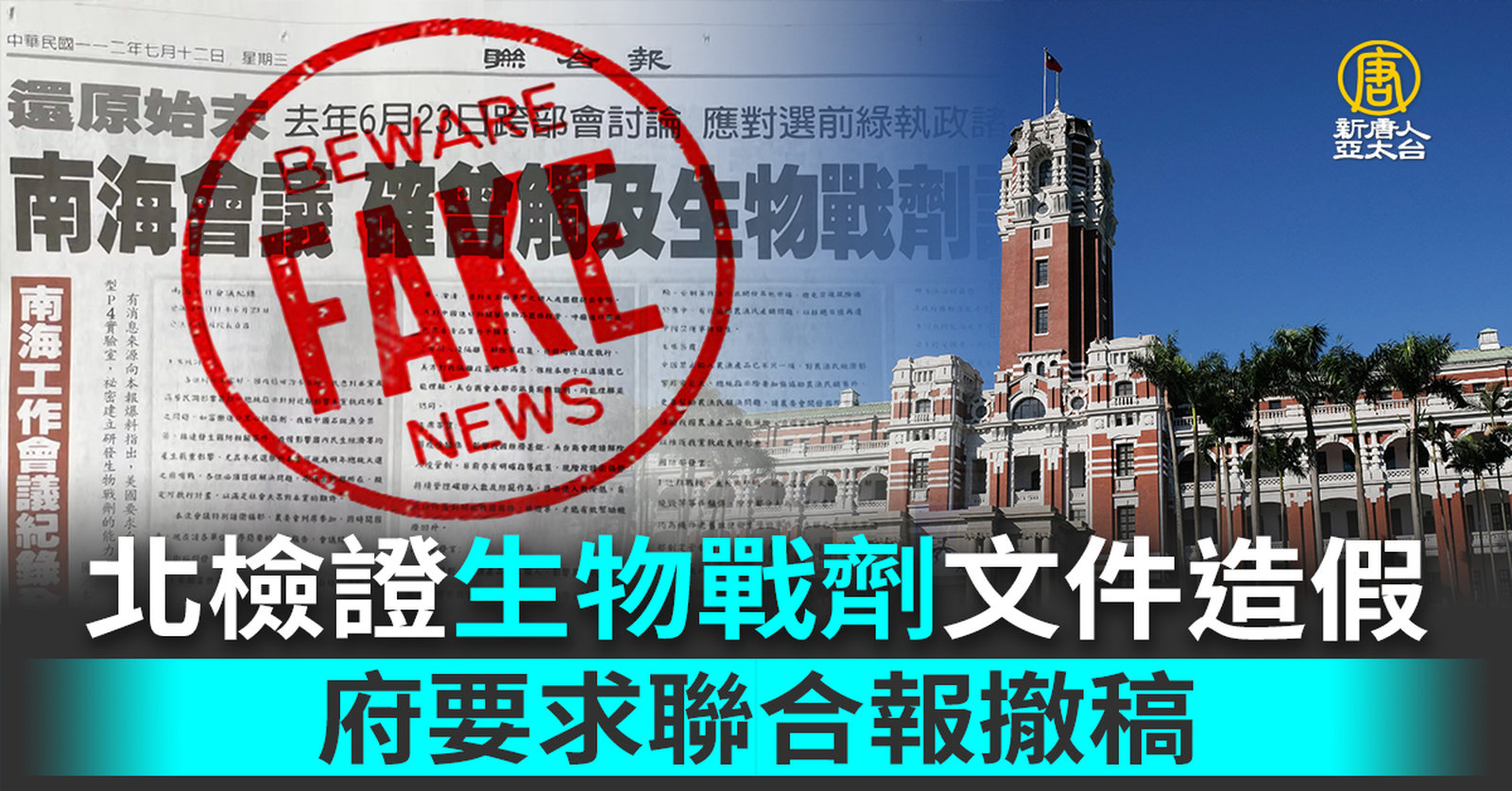 北檢證「生物戰劑」文件造假 府要求聯合報撤稿