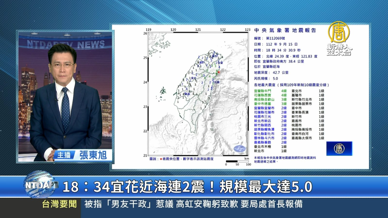 歡迎回來。來關注,周五晚間6點34分,在5秒內一連發生兩起有感地震,分別是震央在花蓮近海的規模4.6地震,以及第二起震央在宜蘭近海的規模5.0地震,地震深度為42.7公里,包括宜蘭縣、花蓮縣,最大震度都有4級,南投、台中也有3級。就連台北市震度1級,也能感受到明顯搖晃。幾乎全台灣有感。 //asset2.ntdtv.com.tw/public/uploads/assets/2023/09/15/2023-09-15-65043fa8cc8e5.mp4 地震|宜蘭|花蓮|地牛翻身2023-09-15 20:47:39