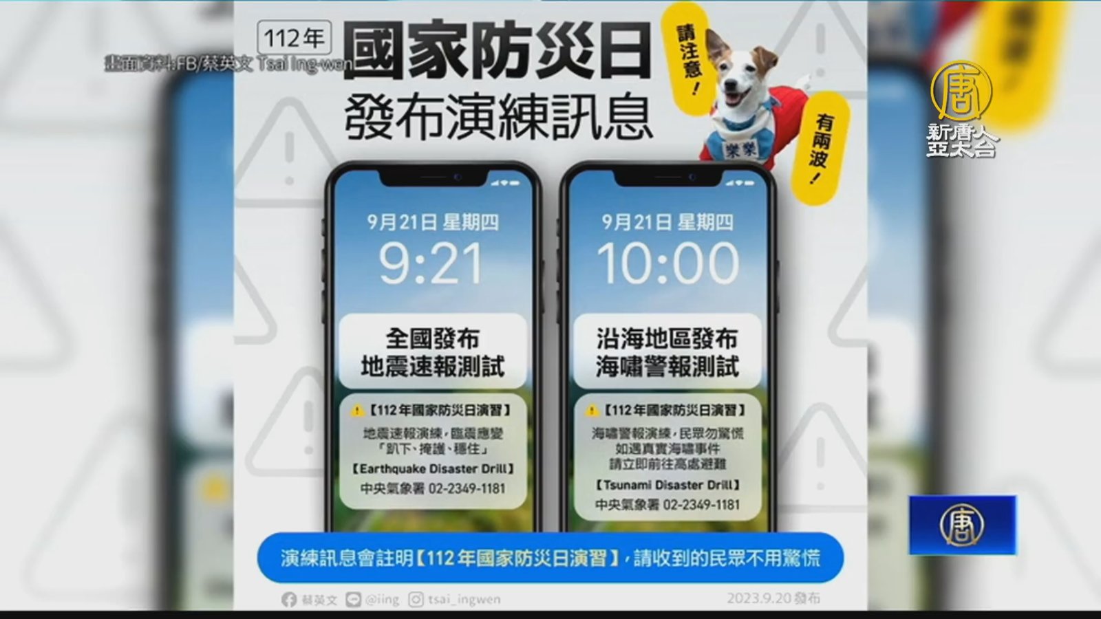 今天9月21日,是台灣的國家防災日,在早上9點21分以及10點整,中央氣象署發布防災演練訊息。今年演練是首次透過全球合作暨訓練架構進行,有19個國家觀摩演練,包括AIT處長孫曉雅等人都到場,總統蔡英文表示,演練除了驗證台灣救援量能,也為參與國際救災預作準備。 //asset1.ntdtv.com.tw/public/uploads/assets/2023/09/21/2023-09-21-650c2461d50ec.mp4 國家防災日|蔡英文|孫曉雅|震災演練|國際救災|921|地震|新竹2023-09-21 19:33:36