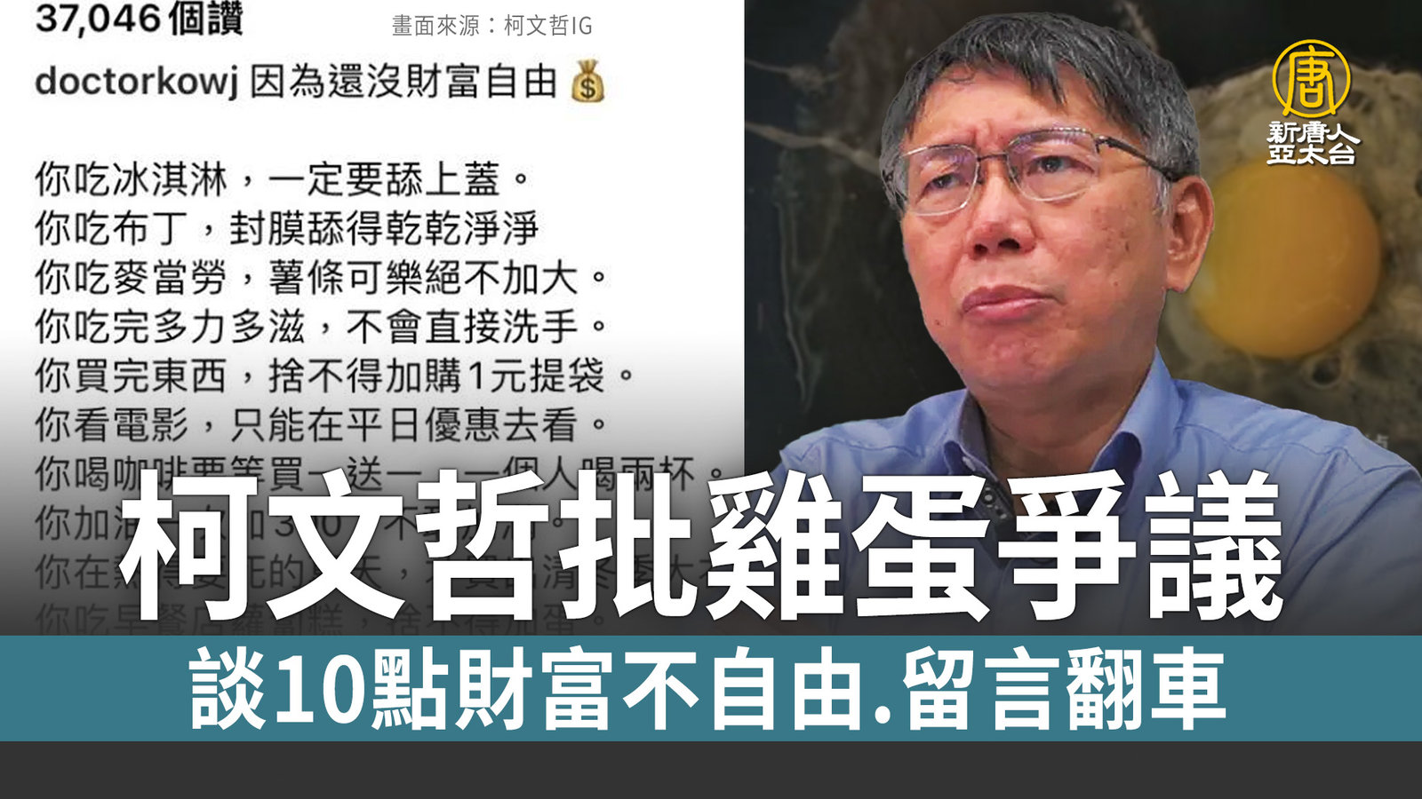 柯文哲批雞蛋爭議 談10點財富不自由.留言翻車