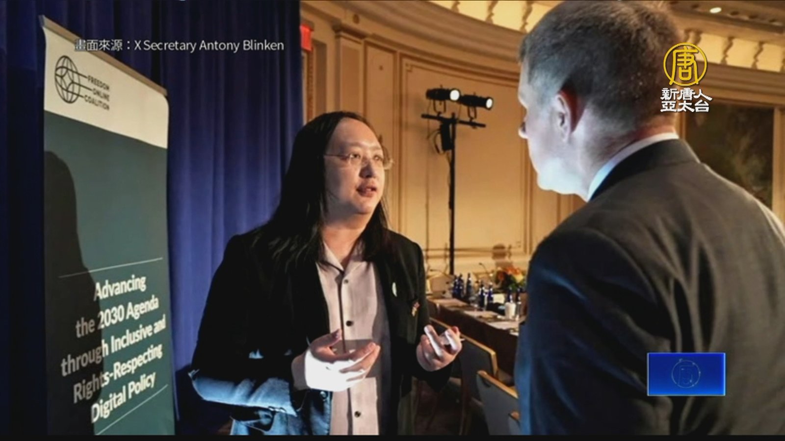 台灣數位部長唐鳳,美東時間20號,出席紐約聯合國大會 場邊舉行的,自由線上聯盟(Freedom Online Coalition, FOC)部長級會議,與美國國務卿布林肯同台。該聯盟關注網路自由與人權、數位民主。現場將近40個國家的數位及外交首長齊聚,討論捍衛自由民主與網路人權的核心價值,並關注因應AI人工智慧帶來的風險。唐鳳表示,台灣支持布林肯所言,全球應確保科技發展是基於合法、負責任,以及符合國際規範,台灣會堅持與民主陣營夥伴站在一起。 //asset2.ntdtv.com.tw/public/uploads/assets/2023/09/21/2023-09-21-650c24dc75732.mp4 唐鳳|FOC|布林肯|自由線上聯盟2023-09-21 19:33:27
