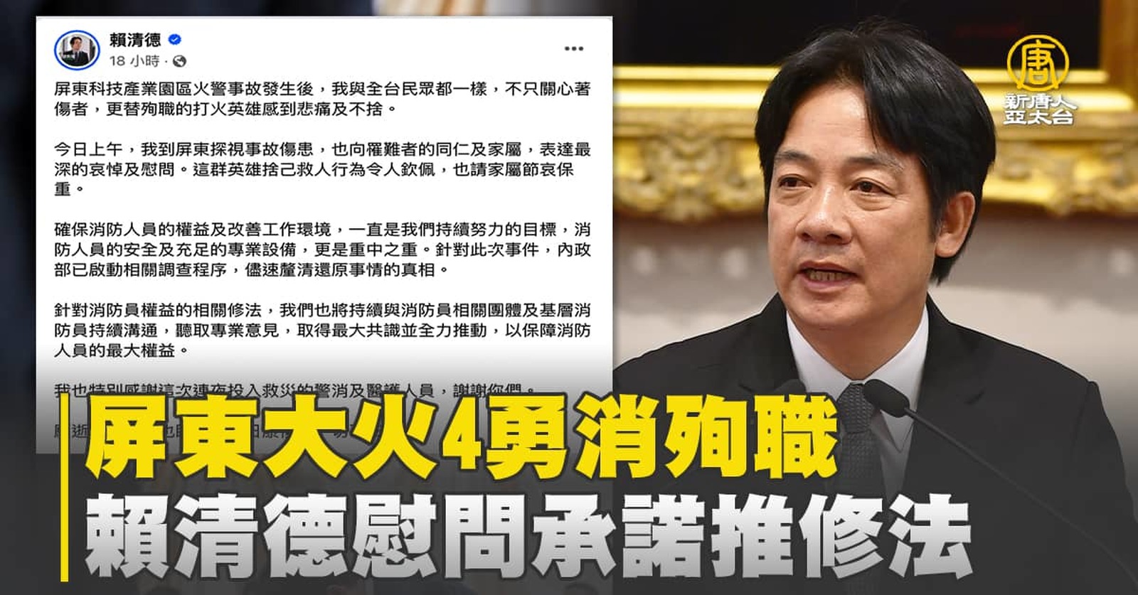 高爾夫球製造商,明揚國際在屏東科技產業園區的廠房,22日發生爆炸大火,包含4名殉職的消防員在內,造成9死1失蹤,逾百人受傷的慘劇。美國在台協會AIT高雄分處發聲明,對受影響的民眾表達最深切的哀悼之意。而英國在台辦事處也發文表示,「在這艱難的時刻,我們與所有受影響的人們同在,並表達深切的哀悼」。 //asset2.ntdtv.com.tw/public/uploads/assets/2023/09/25/2023-09-25-65116a7d24b96.mp4 高爾夫球|明揚國際|屏東|爆炸大火|美國在台協會|英國在台辦事處|哀悼2023-09-25 19:05:37