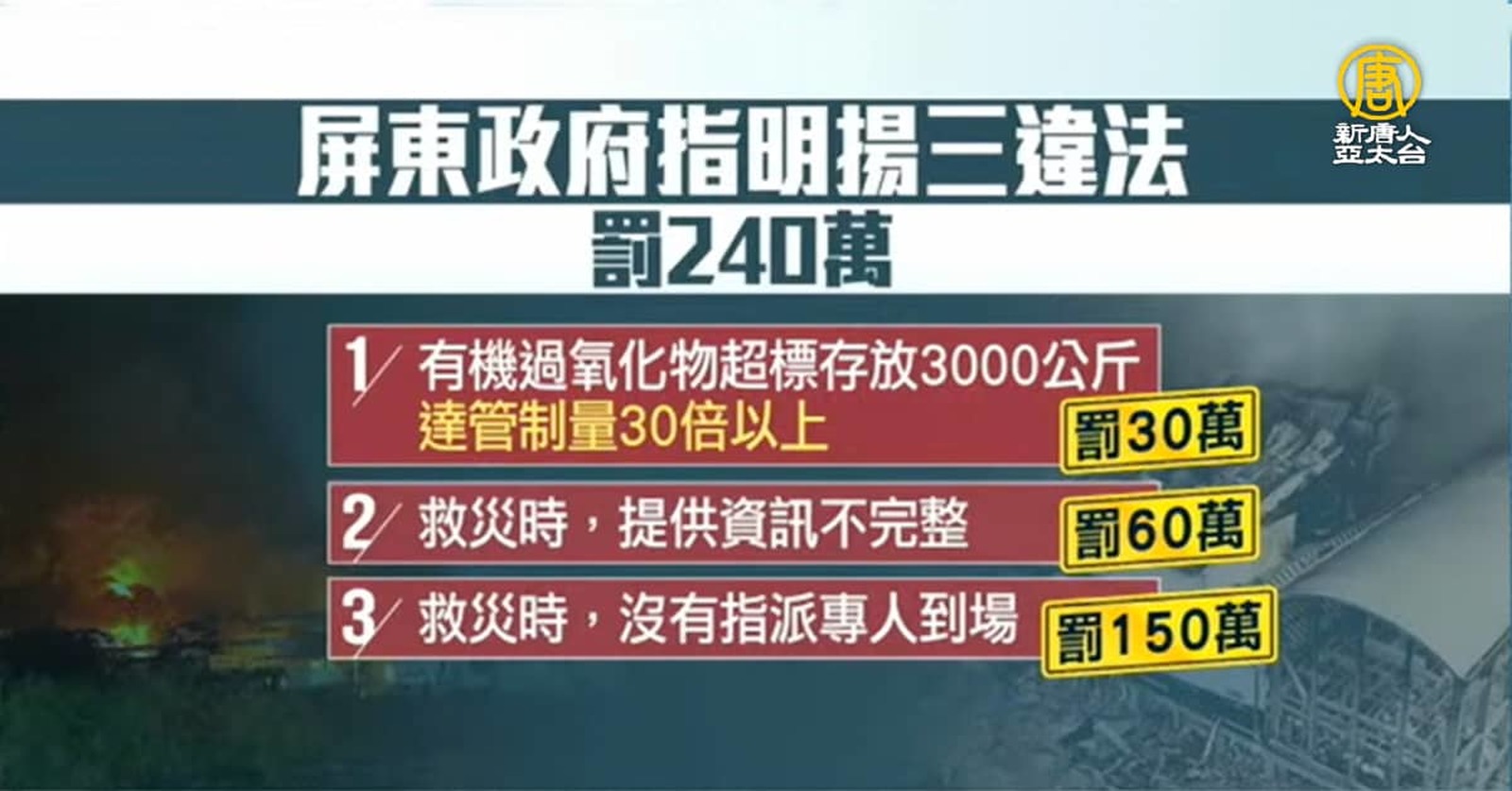屏東的明揚工廠大火造成重大傷亡,屏東縣長周春米今天(25日)表示,明揚公司有三項違法事實,合計共罰240萬新台幣。 //asset1.ntdtv.com.tw/public/uploads/assets/2023/09/25/2023-09-25-65116a6dd4dbd.mp4 屏東大火|屏東|明揚|火警|周春米|劉安?2023-09-25 19:58:56
