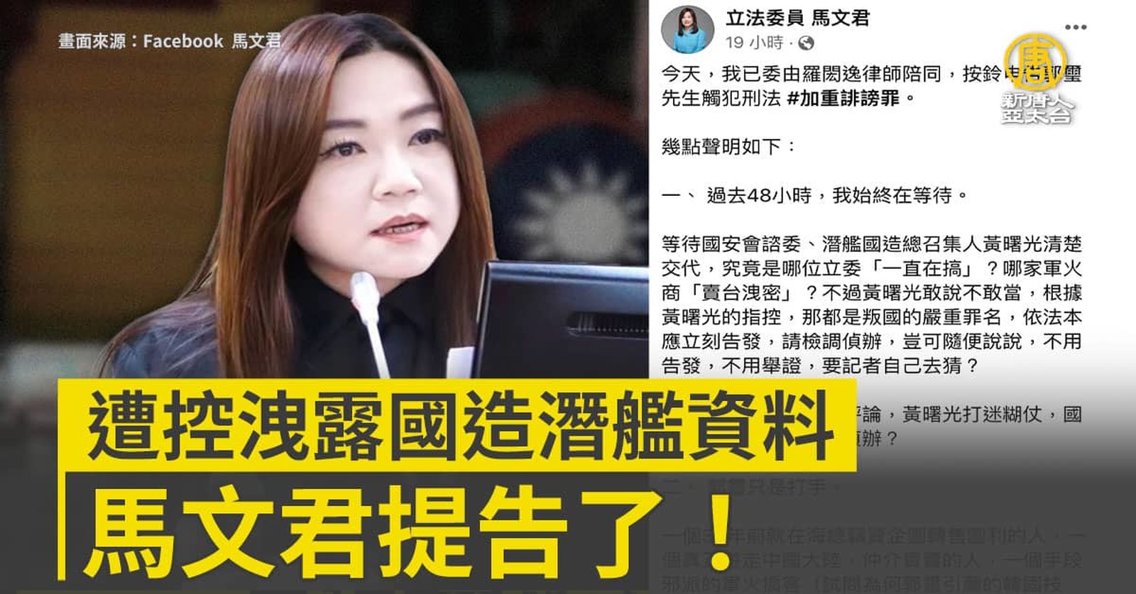 遭控洩露國造潛艦資料 馬文君提告了!