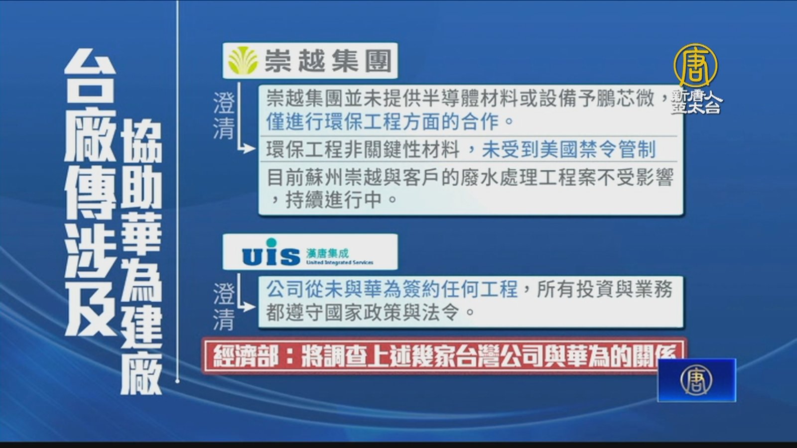 外媒《彭博》報導,有台灣廠商協助中國華為建廠,被質疑可能涉嫌規避美方制裁,消息引起市場波動。對此,台灣經濟部長今天(4日)表示,四家台廠都是低階的環保、廢水處理,沒有涉及關鍵技術。經濟部後續將針對廠商進行調查,有無違反美國實體清單規定,並協助廠商了解,避免誤踩紅線。 //asset3.ntdtv.com.tw/public/uploads/assets/2023/10/04/2023-10-04-651d55e02fc5e.mp4 華為2023-10-04 20:09:04