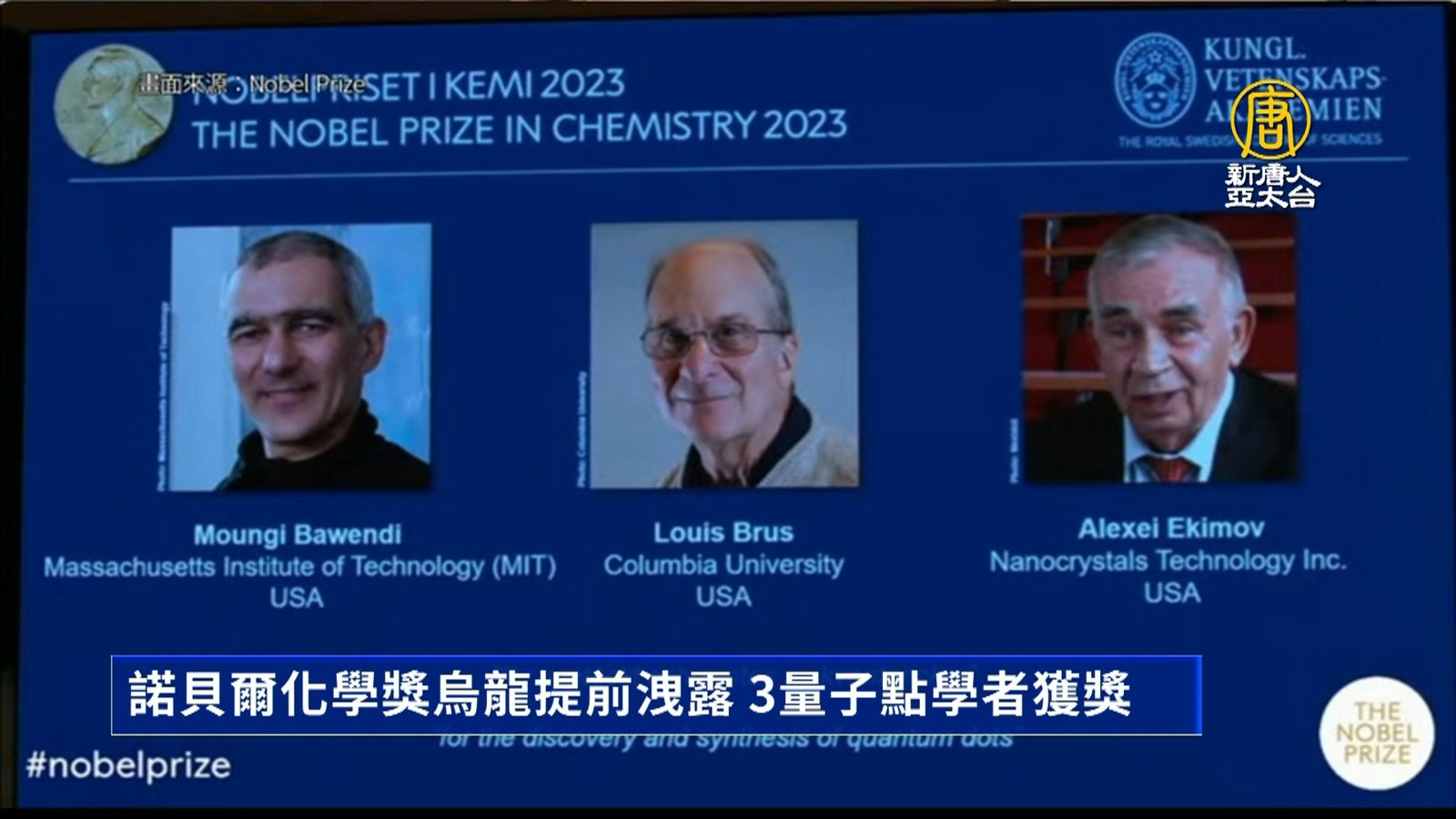 歡迎回到新聞現場。2023諾貝爾化學獎今天(4日)下午5點45分正式揭曉,今年「獎勵量子點的發現與合成」,決定頒發給美國麻省理工學院化學教授 巴旺迪(Moungi G. Bawendi)、美國哥倫比亞大學化學教授 布魯斯(Louise E. Brus)與美籍俄羅斯固態物理學家 埃基莫夫(Alexei I. Ekimov),三位學者共同獲得,不過在當天下午稍早,就先有一份從瑞典皇家科學院的電子郵件副本外流,導致得獎名單提前被揭露,成為本屆烏龍插曲一樁。 //asset1.ntdtv.com.tw/public/uploads/assets/2023/10/04/2023-10-04-651d4fcaa5aa9.mp4 諾貝爾化學獎|巴旺迪|布魯斯|埃基莫夫|量子點|奈米科學2023-10-04 20:00:04