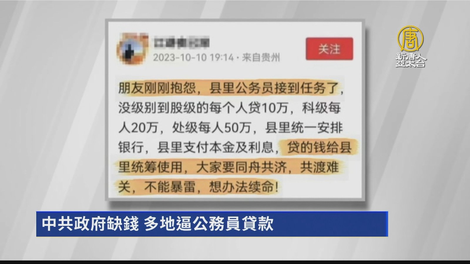 中共財政陷入危機,有消息指,多地政府為了續命,逼迫公務員去貸款。有民眾表示,這個無異於是對公務員群體的最後一次消費,迴光返照的最後一招。 //asset1.ntdtv.com.tw/public/uploads/assets/2023/10/12/2023-10-12-6527da0521529.mp4 公務員|貸款|中國財政危機|地方債2023-10-12 19:32:59