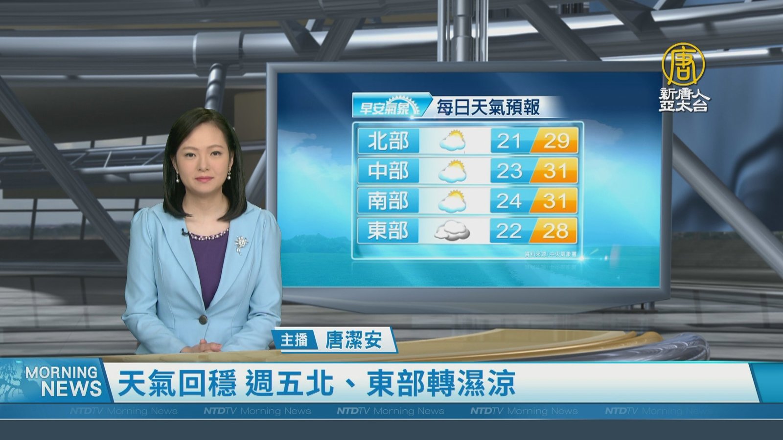 新聞一開始,先來關心天氣,這個禮拜,天氣分2段變化,週四前會稍微回暖、週五起則會轉為濕涼,今天(23日)東北季風減弱,北台灣氣溫再回升,週二北部及東半部高溫可以來到26至29度,中南部在31度左右,普遍都較為舒適到有點熱的天氣,到週四前都將是稍微回暖的天氣型態;週五東北季風再增強,北部及東北部天氣稍轉涼;台灣附近水氣偏多,北部及東半部地區降雨機率則變高。 //asset2.ntdtv.com.tw/public/uploads/assets/2023/10/23/2023-10-23-6536535a7e43a.mp4 天氣|氣象|東北季風2023-10-23 19:01:33