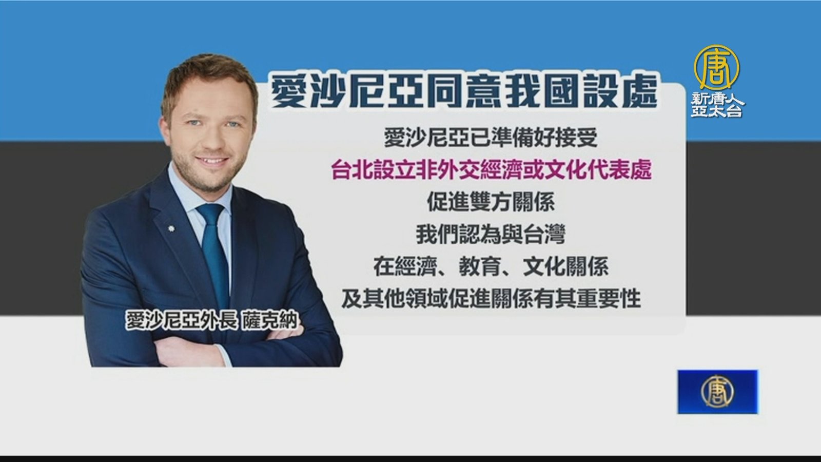 2021年台灣在立陶宛設立「台灣代表處」,如今同樣是波羅的海三小國的愛沙尼亞,也傳出將讓台灣在首都塔林設「台北經濟文化代表處」,不過外交部回應,設處事項雙方尚未達成共識、還在討論當中。 //asset1.ntdtv.com.tw/public/uploads/assets/2023/11/04/2023-11-04-6546278a6ed6e.mp4 愛沙尼亞|塔林|台北經濟文化代表處|立陶宛|台灣代表處2023-11-04 19:37:26