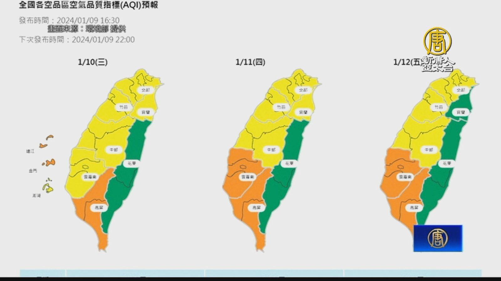 歡迎回來。又要變天了,明天(10日)隨著大陸冷氣團南下,中國山東到上海地區的霾害,也會影響台灣的空氣品質,台灣環境部表示,從明天上午開始,境外污染物會伴隨大陸冷氣團南下,全台空氣品質可能大多是橘色提醒等級;而雲嘉南沿海地區午後因為風速增強,可能引發揚塵現象,影響空氣品質跟能見度;預估中部以北的空氣品質後天11日會逐漸改善,而南部地區則要等到13日擴散條件變好,空氣品質才會好轉。 //asset3.ntdtv.com.tw/public/uploads/assets/2024/01/09/2024-01-09-659d2eaadb06b.mp4 霾害|陰霾|空氣品質|冷氣團2024-01-09 20:22:35