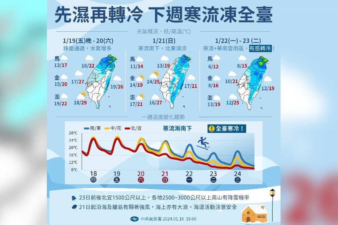 新聞一開始,馬上帶您看到,這幾天(19日)台灣各地偏暖放晴,但入夜後隨著鋒面接近,北台灣將變天。明天(20日)就是24節氣的大寒,週日開始,寒流逐漸南下,各地將會一天比一天冷,下週二、週三是這波冷空氣最冷時刻,北台灣低溫攝氏7到9度,預計到下週四白天,氣溫才會回升。 //asset1.ntdtv.com.tw/public/uploads/assets/2024/01/19/2024-01-19-65aa5852dd94a.mp4 寒流|鋒面|陽明山|降雪2024-01-19 19:03:10