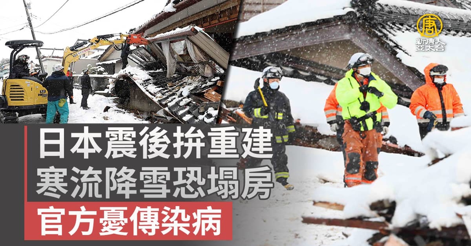 好,日本在元旦當天,石川縣能登半島發生大地震,造成嚴重傷亡。事件迄今屆滿三週,能登也逐步在重建中。但這個禮拜遇上寒流來襲,預估23號到25號將降下大雪,日本氣象廳也提醒,能登半島因地震受損的建物,恐會因積雪重量倒塌,需要多加留意。同時官方擔憂的,還有傳染病問題。 //asset2.ntdtv.com.tw/public/uploads/assets/2024/01/22/2024-01-22-65ae52be08290.mp4 日本地震|能登半島|石川縣2024-01-22 20:06:35