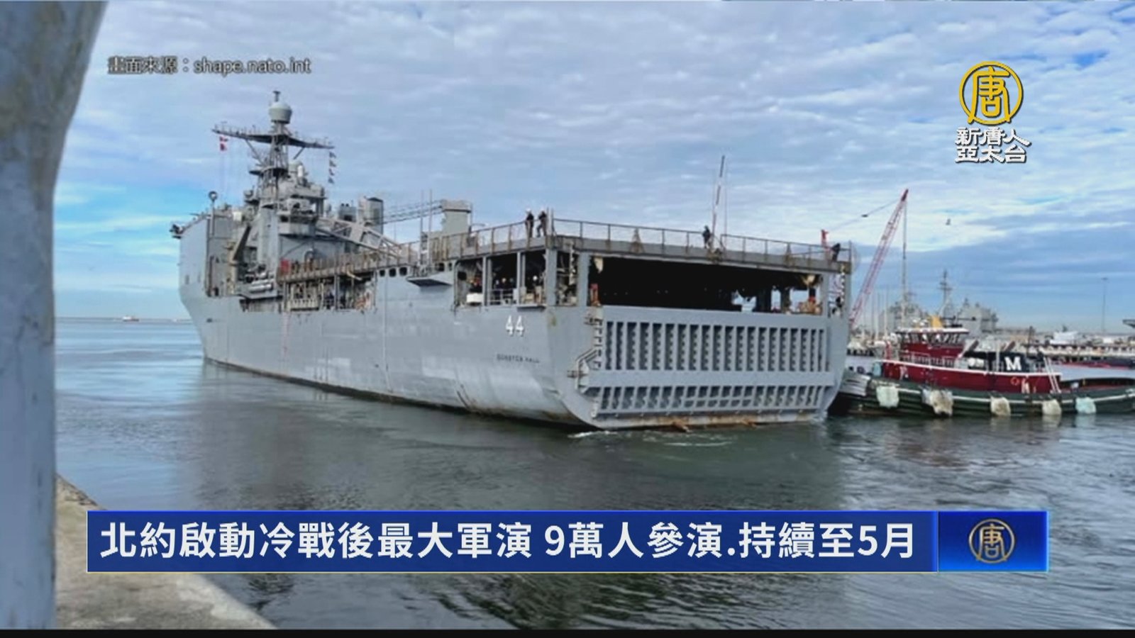 再來關心,北約組織週三(24日)啟動2024年「堅定捍衛者」聯合軍演,美軍的登陸艦甘斯頓霍爾號,也已經駛離維吉尼亞州,為演習揭開序幕。這是自冷戰結束以來,北約規模最大的軍演,一共動員9萬人,以及50多艘軍艦、80架飛機,再加上1100多輛戰鬥車輛。而演習將會在多個地點舉行,預計會一直持續到5月31日。 //asset3.ntdtv.com.tw/public/uploads/assets/2024/01/25/2024-01-25-65b2498d099b4.mp4 北約|堅定捍衛者|聯合軍演2024-01-25 19:43:16