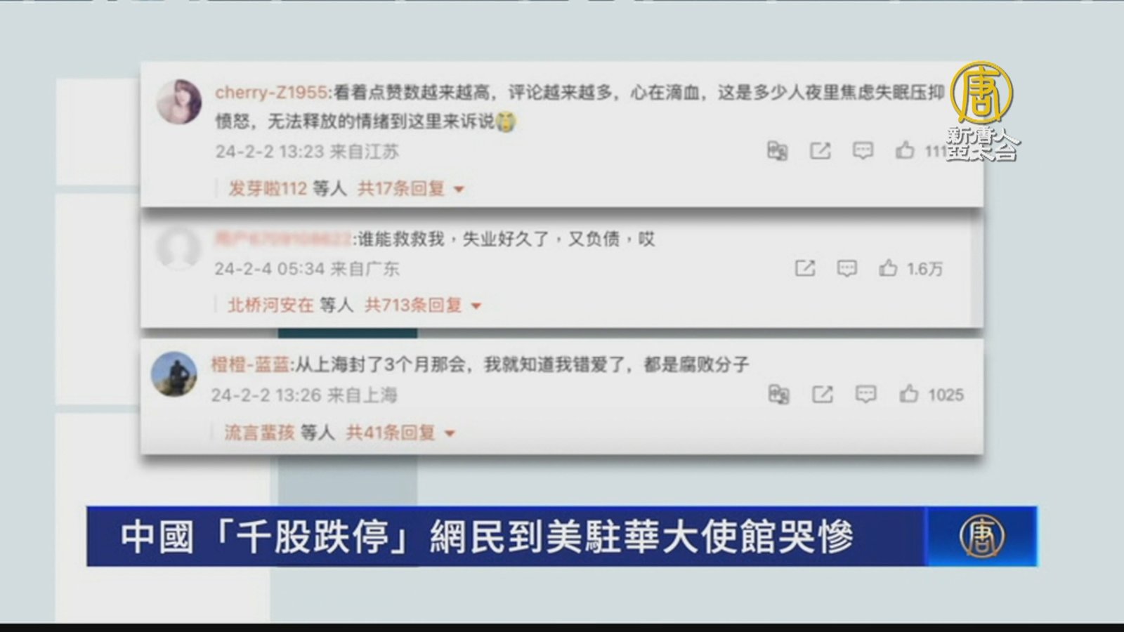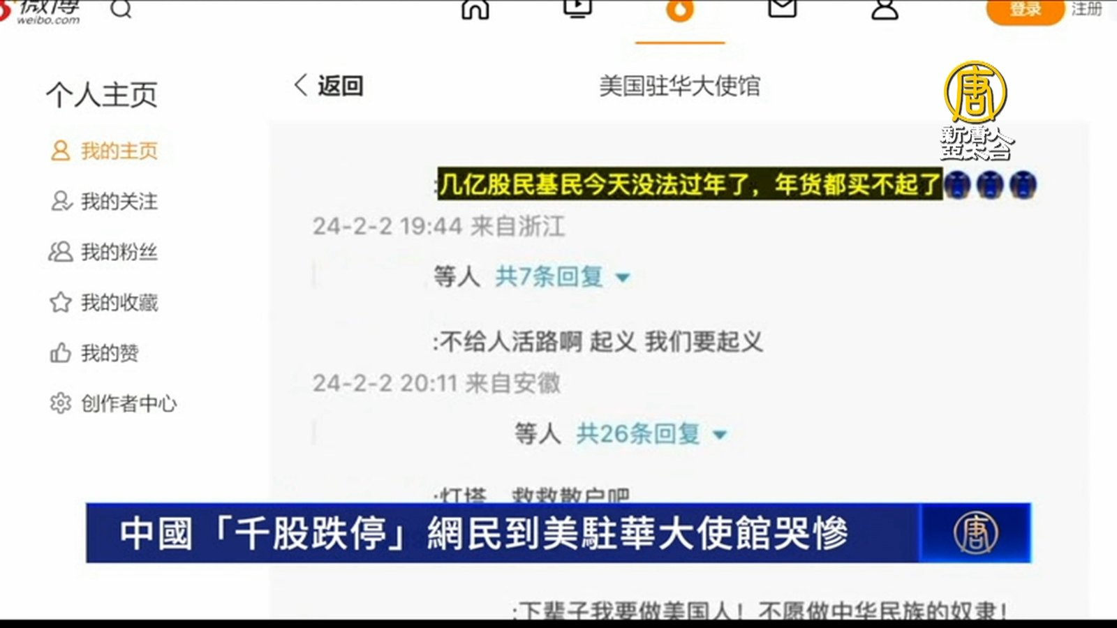 中國股市市值從2021年最高點,暴跌60%多,不少網民無處宣洩,跑到美國和印度駐華大使館的微博,留言訴苦。中共為了開脫找人開刀,稍早中共官媒消息指出,中共證監會主席易會滿被免職。 //asset3.ntdtv.com.tw/public/uploads/assets/2024/02/07/2024-02-07-65c36aa30fd4a.mp4 中國股市暴跌|美國|印度駐華大使館|股民訴苦|中國經濟2024-02-07 19:30:58