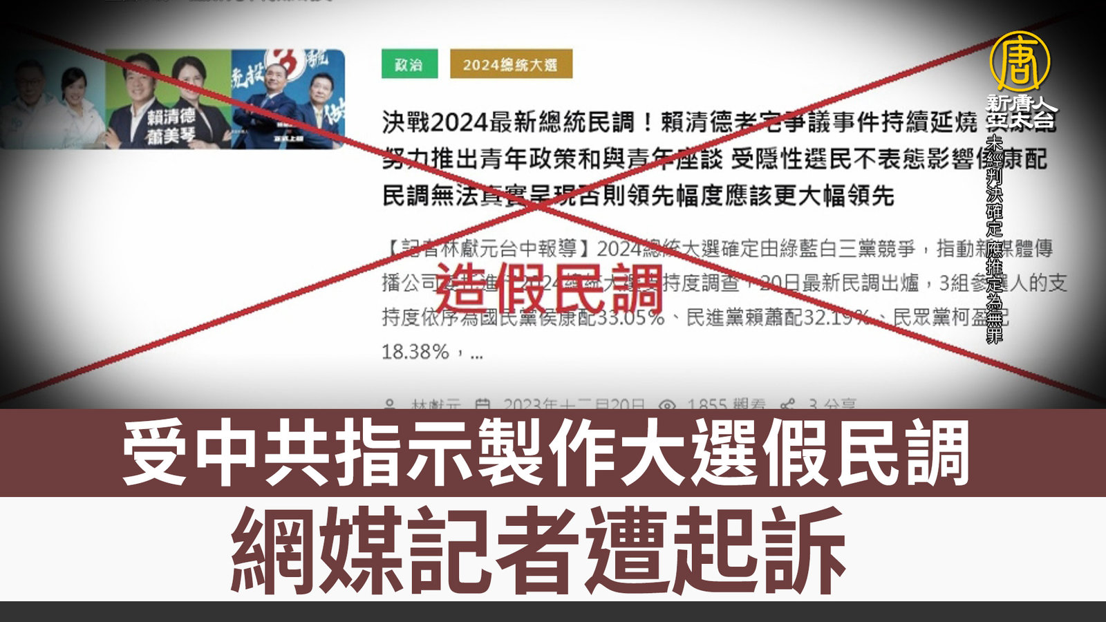 台中一家網路媒體的林姓記者,和自稱民調專家的蘇姓男子,涉嫌受中共國台辦官員指示,在大選期間捏造9次不實民調,再透過網媒做成報導,期間,林姓記者收受中方資金超過新台幣58萬元,檢方偵辦後,依反滲透法罪嫌將林男等人起訴,並建請從重量刑,宣告褫奪公權。 //asset3.ntdtv.com.tw/public/uploads/assets/2024/02/08/2024-02-08-65c4b9840133a.mp4 反滲透法|假民調2024-02-08 19:20:05