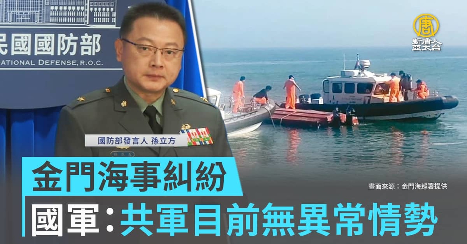 中國快艇闖入金門海域後翻覆,金門檢方調查中。中共海警聲稱要常態巡查,頻頻在金門周邊水域航行。中華民國國防部今天(21日)在例行記者會表示,共軍動態沒有異常,並證實國軍預擬可能狀況加強演練。 //asset3.ntdtv.com.tw/public/uploads/assets/2024/02/21/2024-02-21-65d5da10846b6.mp4 金門|海巡|國軍2024-02-21 21:01:27