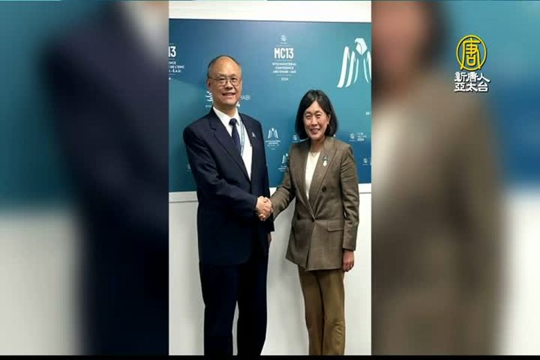 行政院政務委員鄧振中在世界貿易組織(WTO)部長會議期間,會晤美國貿易代表戴琪。行政院經貿談判辦公室指出,雙方對目前進行中的台美21世紀貿易協定談判,廣泛交換意見,將責成談判人員加速在勞工、農業及環境三項議題技術層面的討論。雙方也就非市場經濟國家,經由不公平政府補貼,造成產業生產過剩,嚴重妨害世界貿易體系等,深入討論。兩人是繼去年11月亞太經合部長會議之後,再次會面。 //asset2.ntdtv.com.tw/public/uploads/assets/2024/02/29/2024-02-29-65e067d9c2ed5.mp4 美台|鄧振中|戴琪2024-02-29 19:15:20