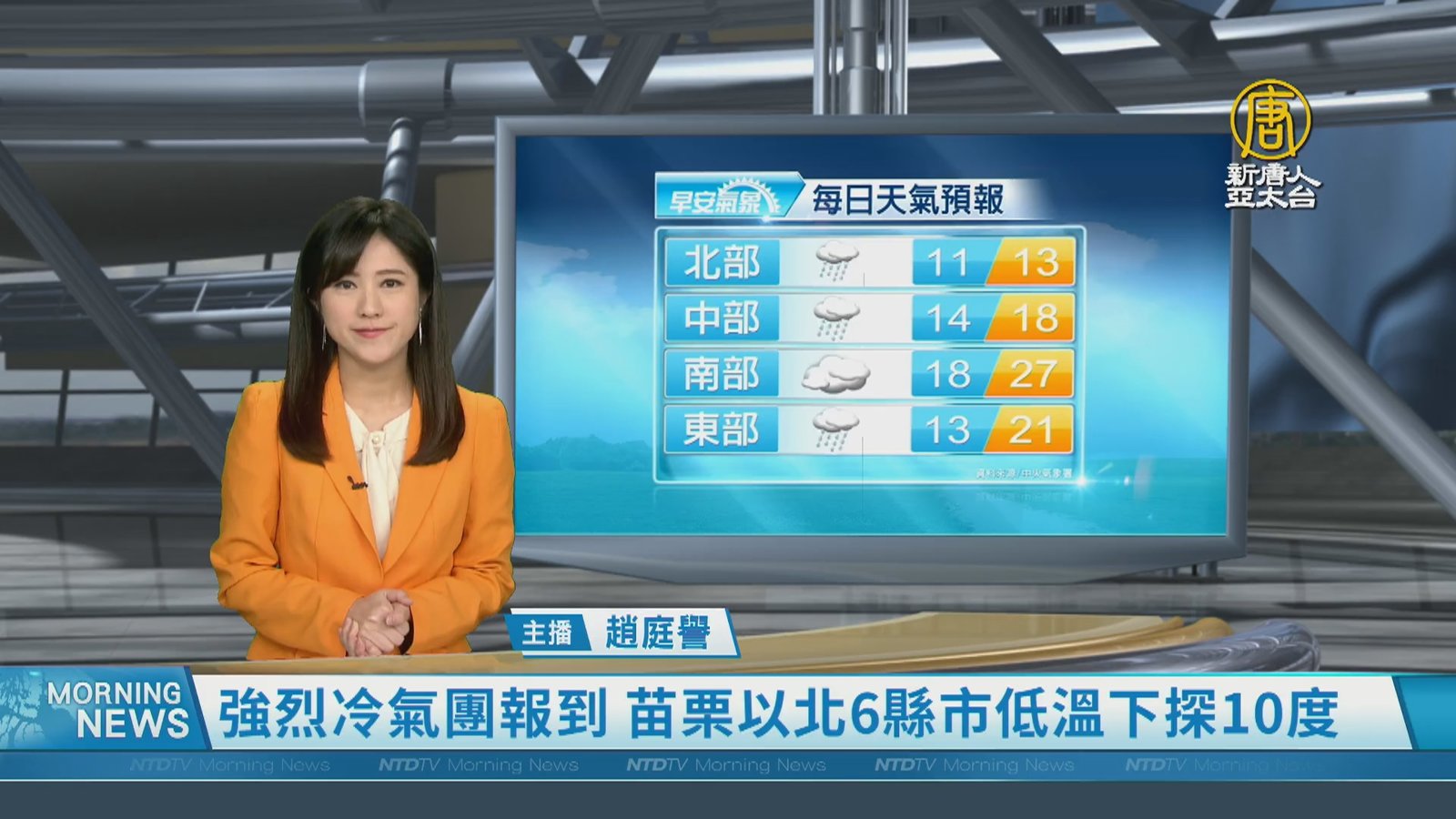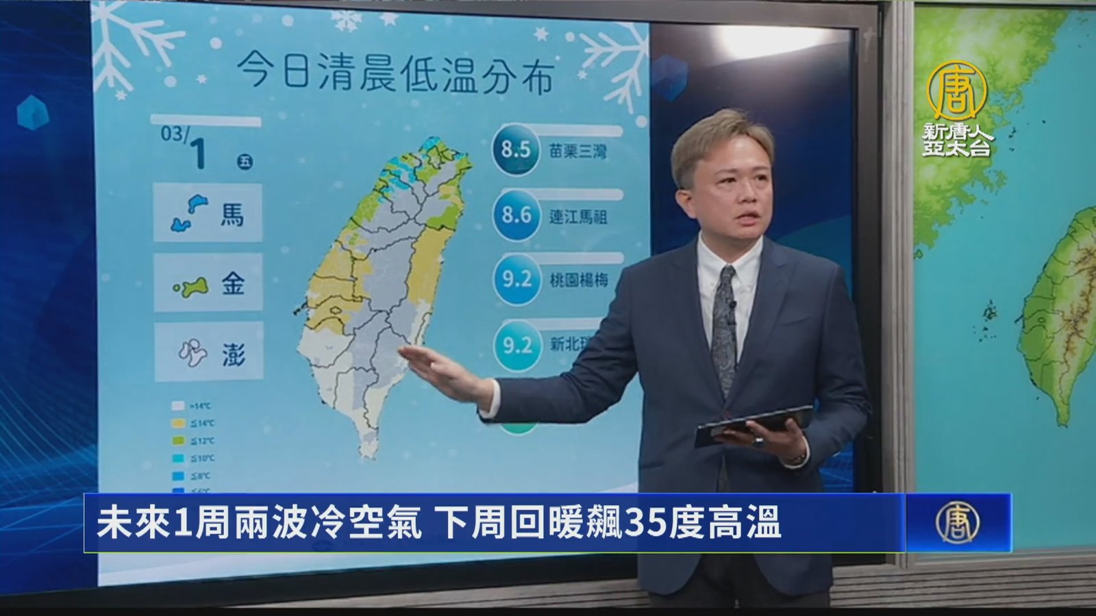 新聞開始來關心天氣,北台灣急凍,低溫特報範圍擴大。今天受強烈大陸冷氣團影響,氣象署對11個縣市發布低溫特報,其中10個縣市亮橙色燈號。今天周五入夜後一路冷到週六,北台灣低溫可能降到攝氏10度以下;降雨部分與周五類似,主要在中部以北的山區、及基隆北海岸有較大雨勢。 //asset3.ntdtv.com.tw/public/uploads/assets/2024/03/01/2024-03-01-65e1b7165c53a.mp4 氣象|天氣|低溫特報|下雪2024-03-01 19:02:44