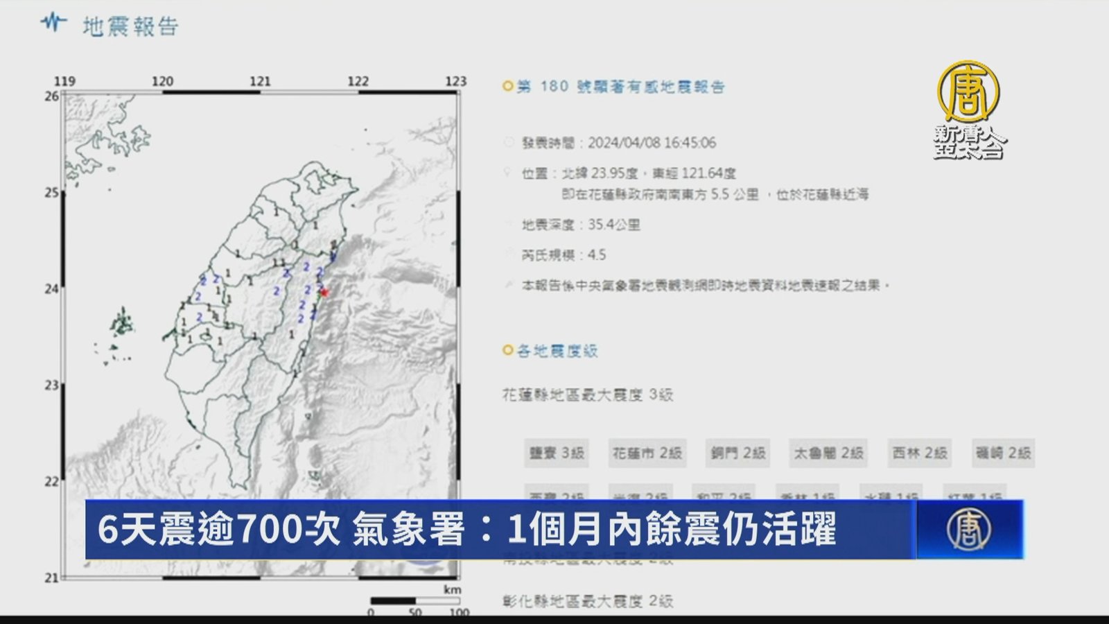 好,花蓮3日發生規模7.2強震,6天來大小餘震不斷,今天下午4時45分,在花蓮縣近海又發生芮氏規模4.5地震,地震深度35.4公里。下午1點09分也發生一起規模5.1地震,最大震度在花蓮和平和宜蘭澳花,達到4級,台北也有感。累積至8日下午3點,餘震數已達751起,規模5以上的有28起,氣象署提出,未來1個月內餘震仍活躍,甚至不排除有規模5以上餘震發生,提醒民眾,避免前往山區活動,並注意防震措施。 //asset1.ntdtv.com.tw/public/uploads/assets/2024/04/08/2024-04-08-6613d02a67487.mp4 花蓮7.2強震|餘震|中央氣象署|防震2024-04-08 19:03:43