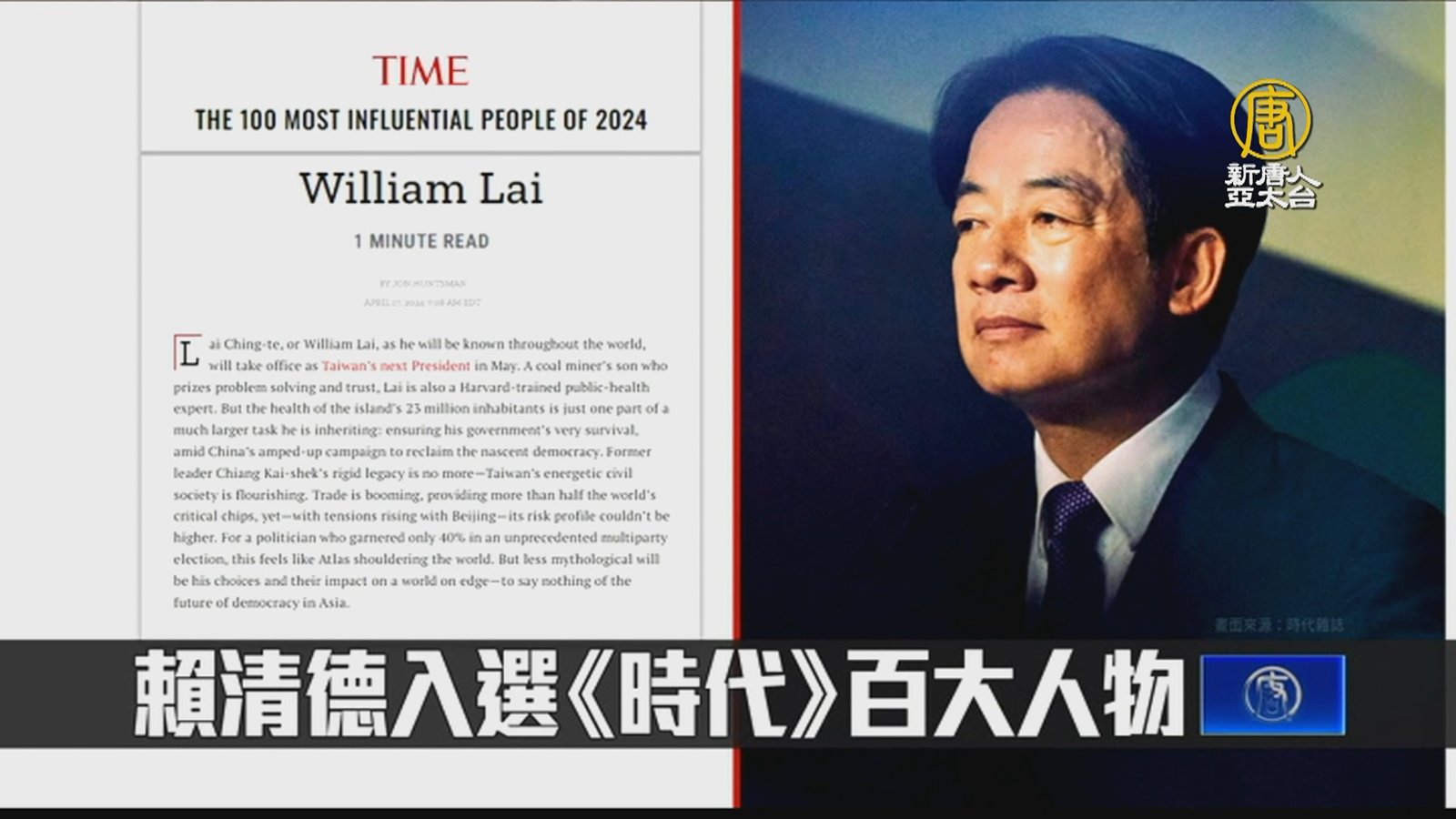 再來看到,美國《時代雜誌》週四公布2024年百大最具影響力人物名單,其中,即將在520上任的準總統賴清德也登榜,總統府指出,這是國際對台灣民主的重要肯定。 //asset3.ntdtv.com.tw/public/uploads/assets/2024/04/18/2024-04-18-6621002d14a10.mp4 時代雜誌|百大人物|賴清德2024-04-18 19:38:54