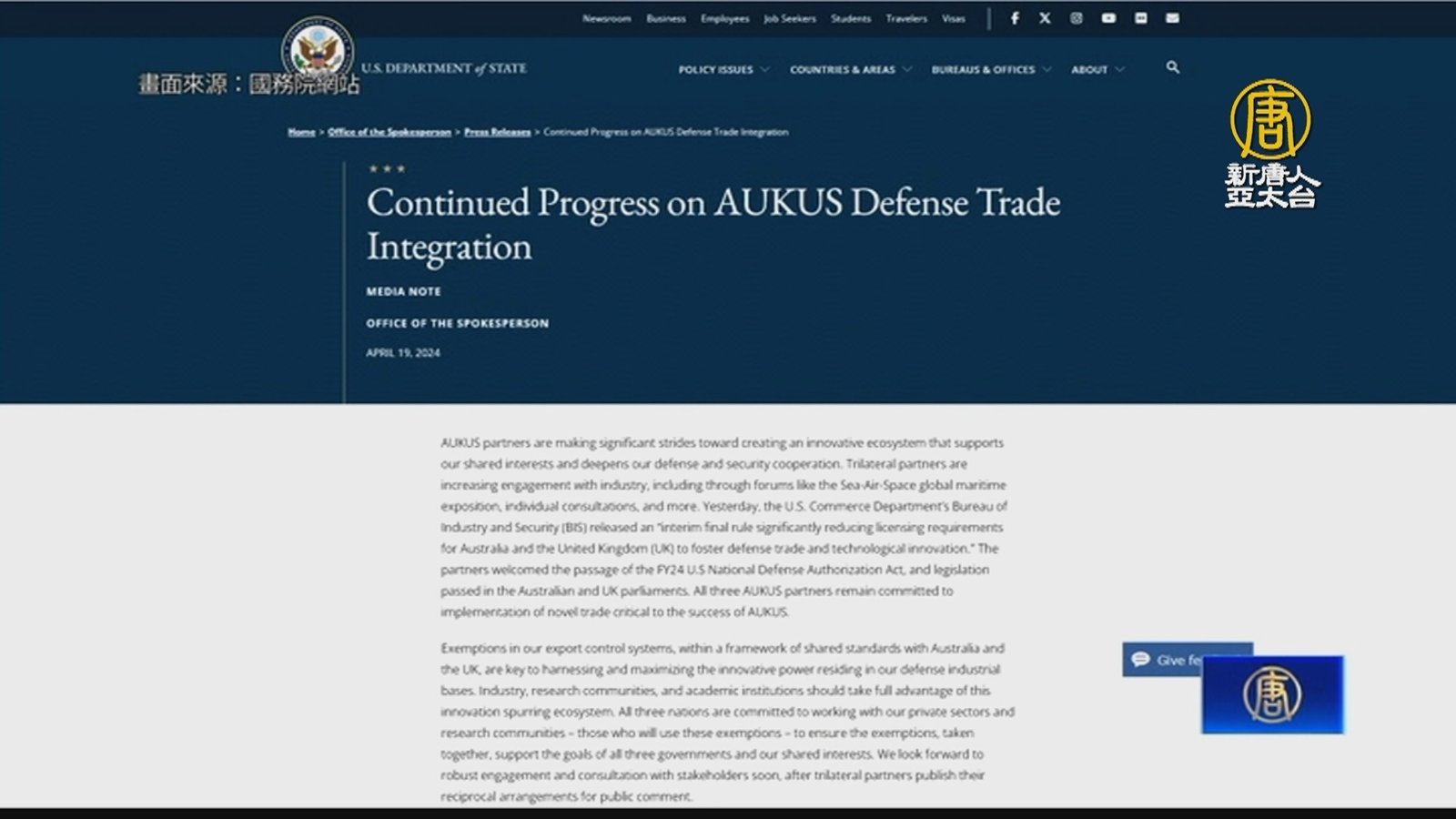 深化澳英美三方安全夥伴關係(AUKUS)合作,美國國務院週五表示,預計未來120天內,敲定AUKUSS國防專案的新貿易管制豁免。對此,英國與澳洲國防部,也分別做出正面回應。 //asset1.ntdtv.com.tw/public/uploads/assets/2024/04/20/2024-04-20-6623a435977f0.mp4 澳英美安全夥伴關係|AUKUS|國防授權法案|拜登|貿易豁免2024-04-20 19:16:04