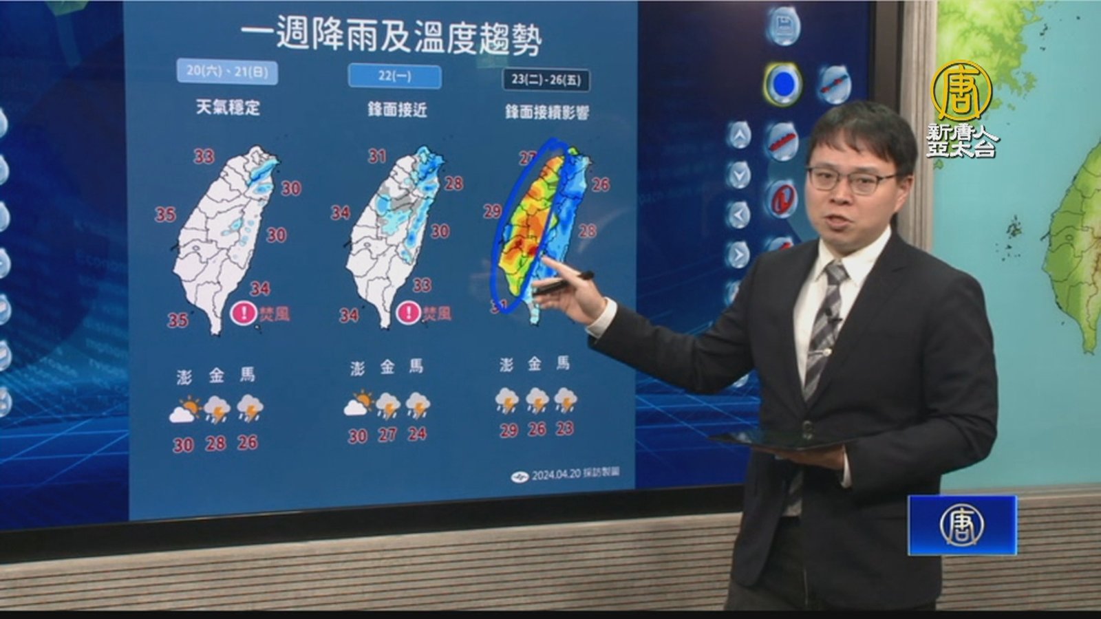 帶您關心天氣,今天(20日)全台各地溫暖悶熱,台東縣最高溫測得37.5度,預計週末兩天都是晴朗穩定的天氣型態。把握週日好天氣,因為下週一開始鋒面接近,全台將轉為有雨天氣,預計這兩波鋒面帶來的雨勢將影響到下週五。 //asset1.ntdtv.com.tw/public/uploads/assets/2024/04/20/2024-04-20-6623af8004464.mp4 天氣|鋒面|強降雨|氣象署2024-04-20 20:05:20