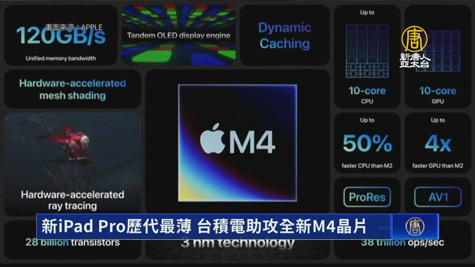 蘋果最新線上發表會,在昨天晚間登場,推出全新一代平板電腦。首次搭載了第二代3奈米技術M4晶片、OLED顯示器。蘋果表示,新款iPad Pro擁有市面上最好的網路處理器。 //asset1.ntdtv.com.tw/public/uploads/assets/2024/05/08/2024-05-08-663b6082458c3.mp4 iPad|蘋果|M4|台積電2024-05-08 19:20:21