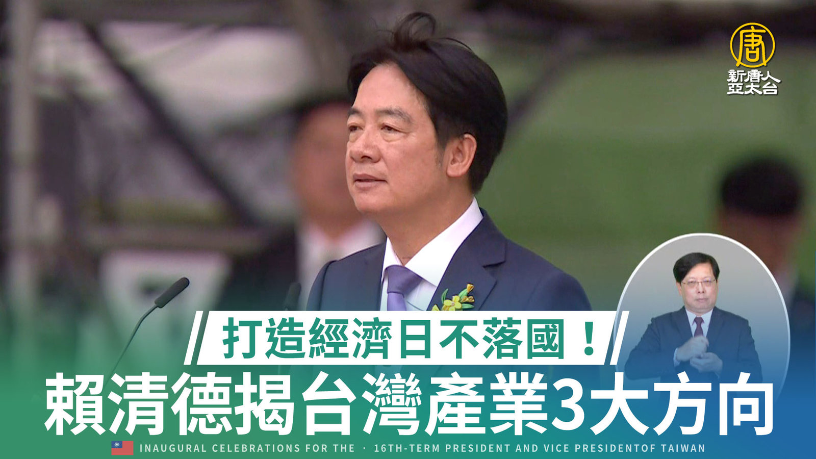 520賴清德宣布就職,產業政策也成為焦點,賴清德宣布未來三大方向,台灣要發展半導體、AI、低軌道衛星在內五大信賴產業,同時加強國際連結,行銷到全世界。現場不僅台積電創辦人張忠謀現身,力積電董事長黃崇仁、和碩董事長童子賢都到場,足見產業界高度關注。 //asset1.ntdtv.com.tw/public/uploads/assets/2024/05/20/2024-05-20-664b30d84945d.mp4 賴清德|520|產業政策|經濟|賴清德總統就職|520就職典禮2024-05-20 19:13:07