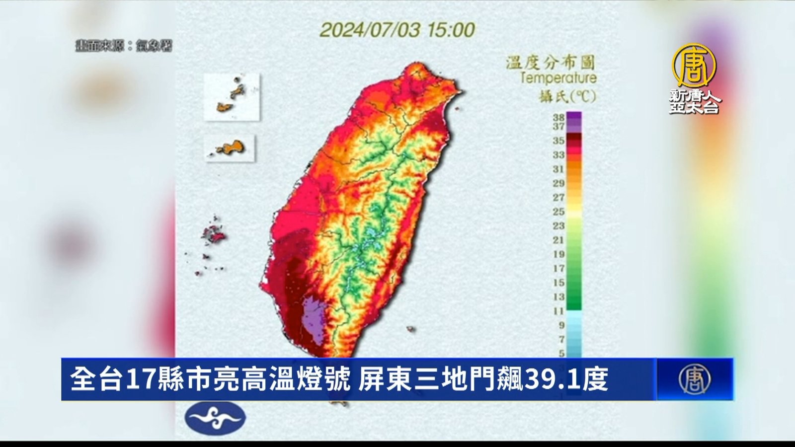 新聞一開始,來關心天氣,台灣各地今天持續高溫炎熱,全台灣熱的像是一個燒蕃薯,根據中央氣象署網站,今天下午嘉義、台南、高雄、屏東都出現攝氏38度以上的極端高溫;下午3點半,最高溫出現在屏東的三地門,測到39.1度;氣象署也針對17個縣市發布高溫資訊。氣象署表示,接下來幾天,還是以高溫炎熱的天氣為主,未來3天太平洋高壓稍微增強,所以午後雷陣雨有減少的趨勢,從今天周三到週六,中南部、大台北地區還是有機會出現極端高溫情形。 //asset2.ntdtv.com.tw/public/uploads/assets/2024/07/03/2024-07-03-66853156bf91d.mp4 高溫|天氣2024-07-03 19:03:51