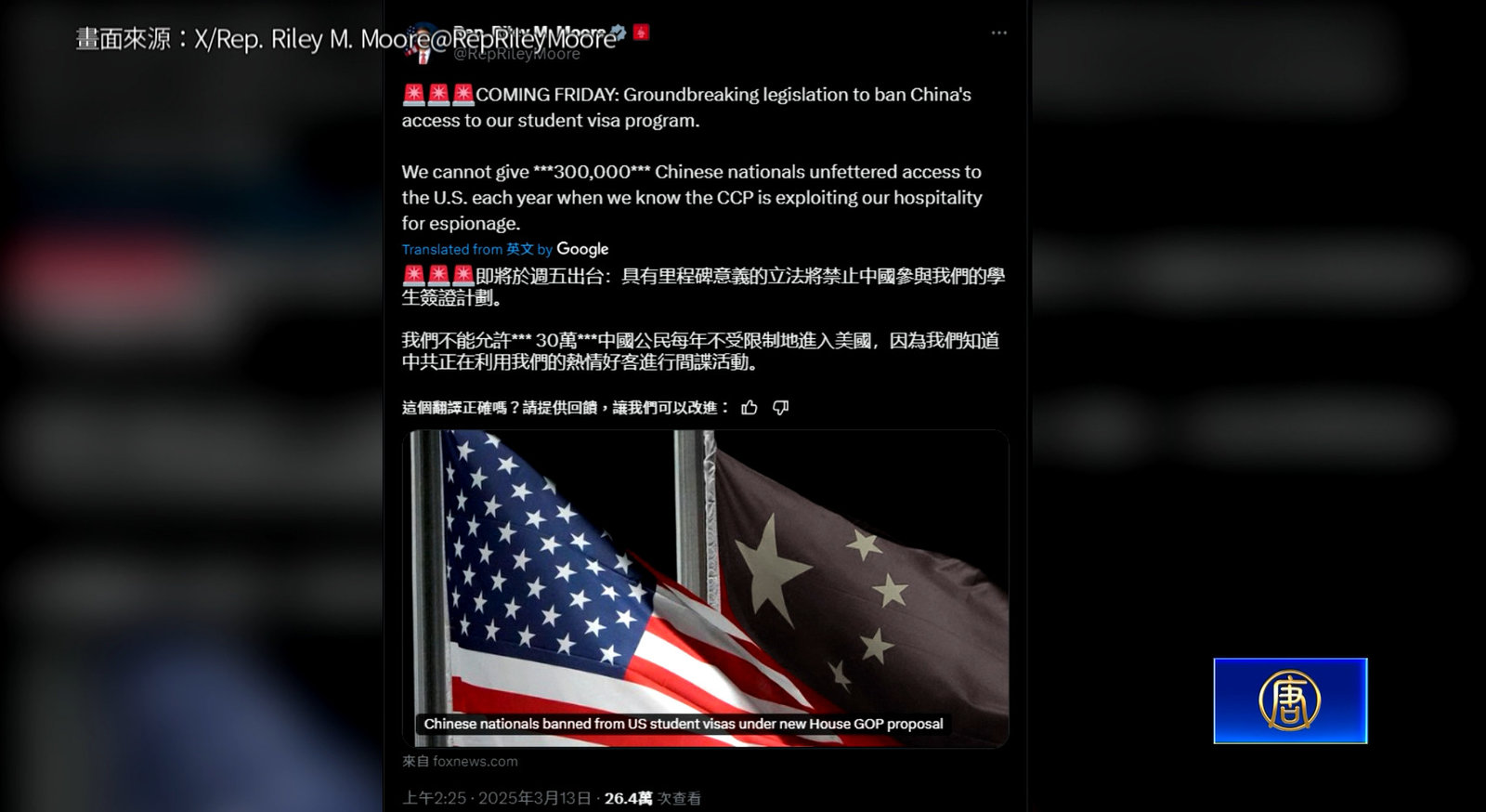 歡迎回來。國際防堵中共滲透,美國國會持續推進多項法案反制中共滲透,共和黨眾議員摩爾今天將提出「阻止中共簽證法案」,禁止中國公民取得學生簽證。摩爾表示,美國每年允許近30萬名中國公民持學生簽證赴美,實際上是在邀請中共監視美軍,竊取智慧財產權,及威脅國家安全。就在去年,5名持學生簽證的中國公民,因為拍攝密西根州國民兵與台灣軍方進行訓練,而被聯邦調查局FBI調查追訴。摩爾強調,「這種情況不能再繼續下去」。 //www.ntdtv.com.tw/public/uploads/assets/2025/03/14/2025-03-14-67d41e71ab8dc-220x120-854467.jpg 美國國會|阻止中共簽證法案2025-03-14 20:26:11