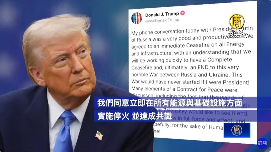 新聞首先來看到,俄烏局勢的最新情況。週二,美國總統川普與俄羅斯總統普丁通話,試圖推進終結俄烏戰爭。雖然普丁同意,暫停攻擊烏克蘭能源和基礎設施,但當天晚間,俄羅斯和烏克蘭仍互相空襲、攻擊對方。烏克蘭總統批評,「普丁形同拒絕了全面停火提議。」 //www.ntdtv.com.tw/public/uploads/assets/2025/03/19/2025-03-19-67dab66d25ac1-220x123-169.jpg 俄烏戰爭|澤倫斯基|川普|普丁|停火2025-03-19 20:23:05