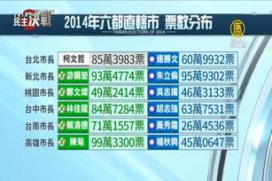 2018-11-24 18:27:13好,趕快來看到,這次有多個投開票所,延後開票,一直到下午四點,都還有許多民眾在投票;來看到,開票的最新情況,先來看到的是台北市長的部分,現任的台北市長柯文哲的票數來到15萬3千989票,國民黨丁守中,是緊追在後14萬1千711票,再來是民進黨的候選人姚文智,票數來到9萬643票。|再來看到高雄市長的部分,國民黨候選人韓國瑜,票數來到23萬2千112票,民進黨候選人陳其邁則是23萬4千934票。|再來看到台中的部分,現任市長,民進黨候選人林佳龍,票數來到了11萬4千459票。國民黨的盧秀燕,現在開出的票數是