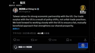 賴總統:關稅未合理反映台美貿易 將強力交涉